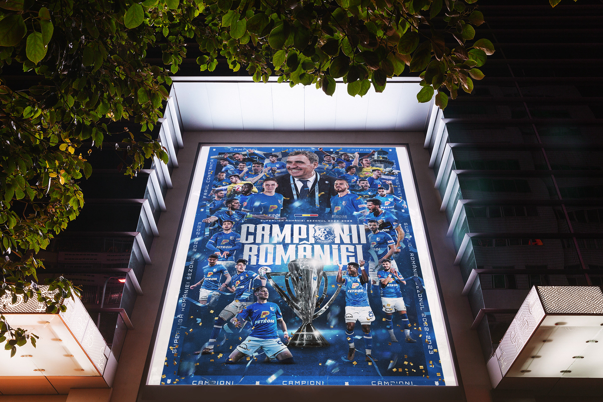 Context: Creation and execution of the complete art direction for the celebrations marking Farul Constanta’s historic Superliga Romania title in the 2022/2023 season. An all-encompassing art direction, including the creation of various graphic assets to be featured across multiple platforms and media channels. The project includes digital communication on social media, official merchandise, LED graphics at the stadium, stage design for the public celebration in the city center, and more.