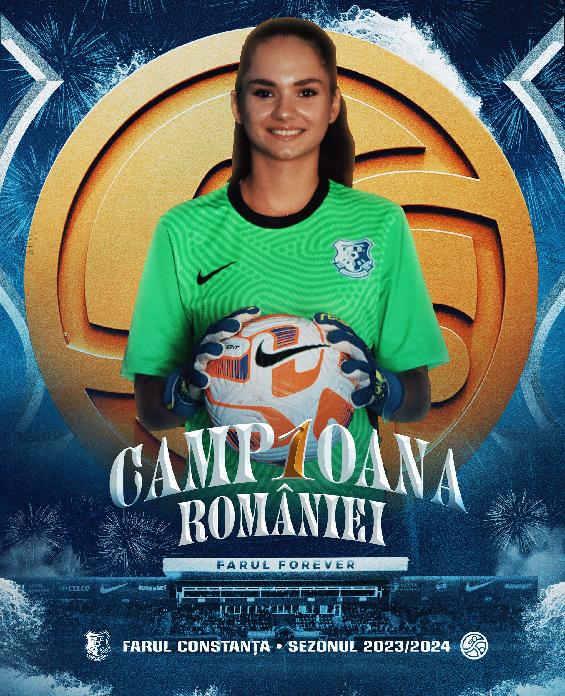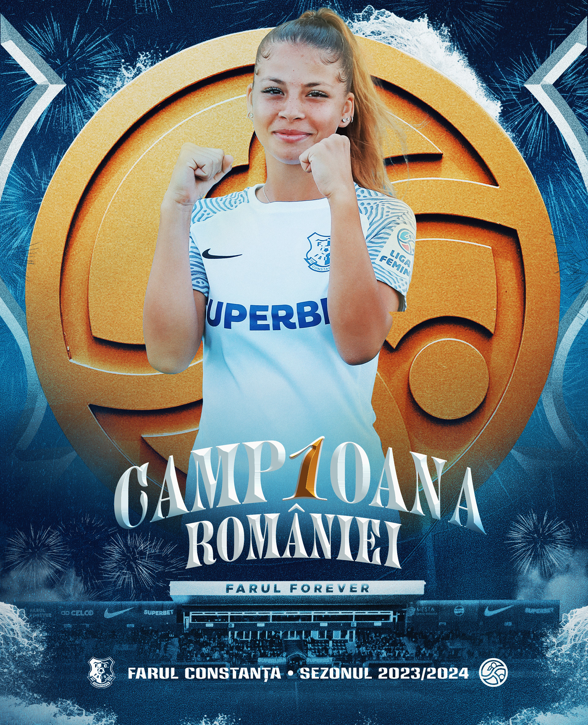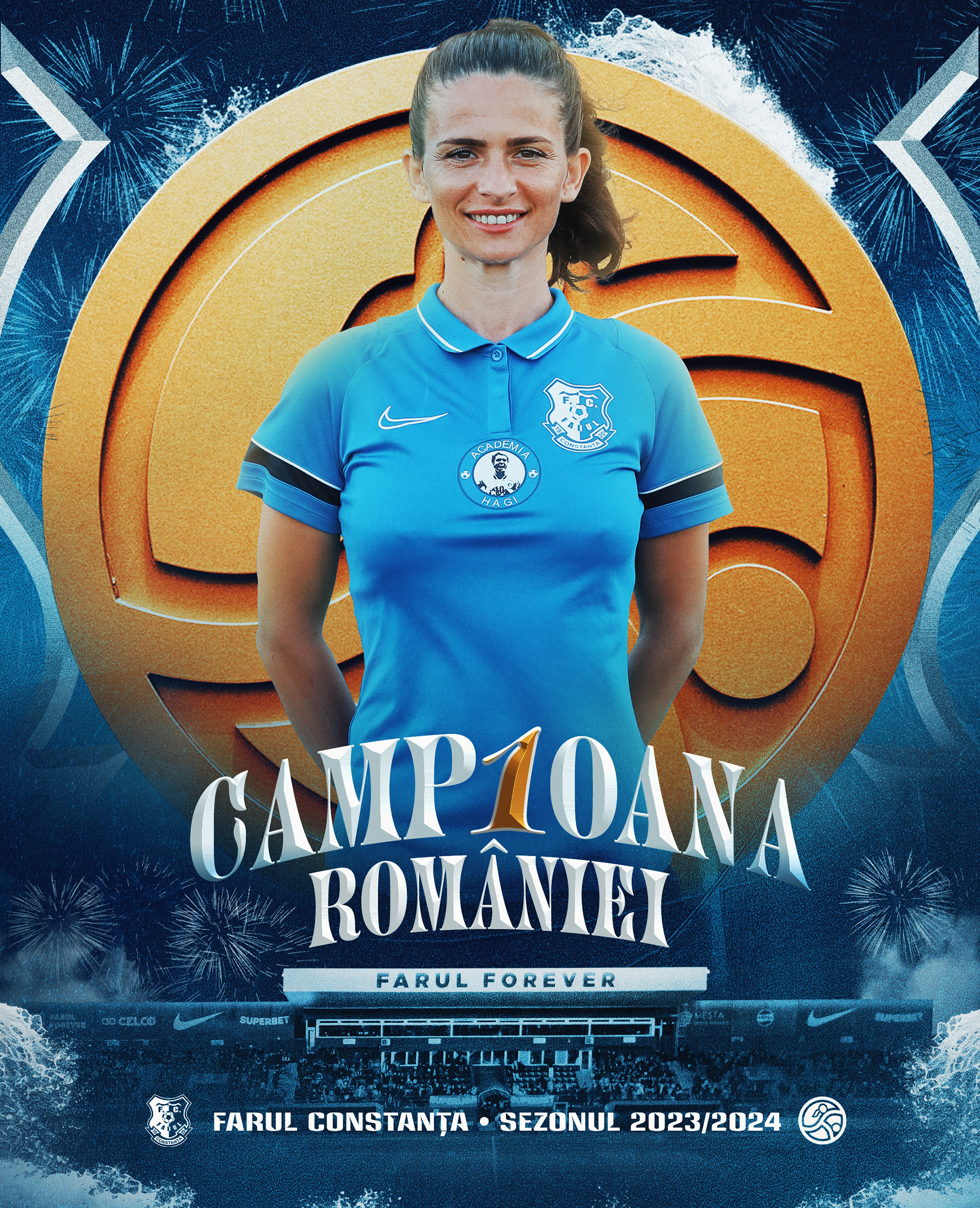 Context: Creation and execution of the complete art direction for the celebrations marking Farul Constanta Women’s historic Superliga Feminina title in the 2023/2024 season. An all-encompassing art direction, including the creation of various graphic assets to be featured across multiple platforms and media channels. The project includes digital communication on social media, official merchandise, LED graphics at the stadium, and more.