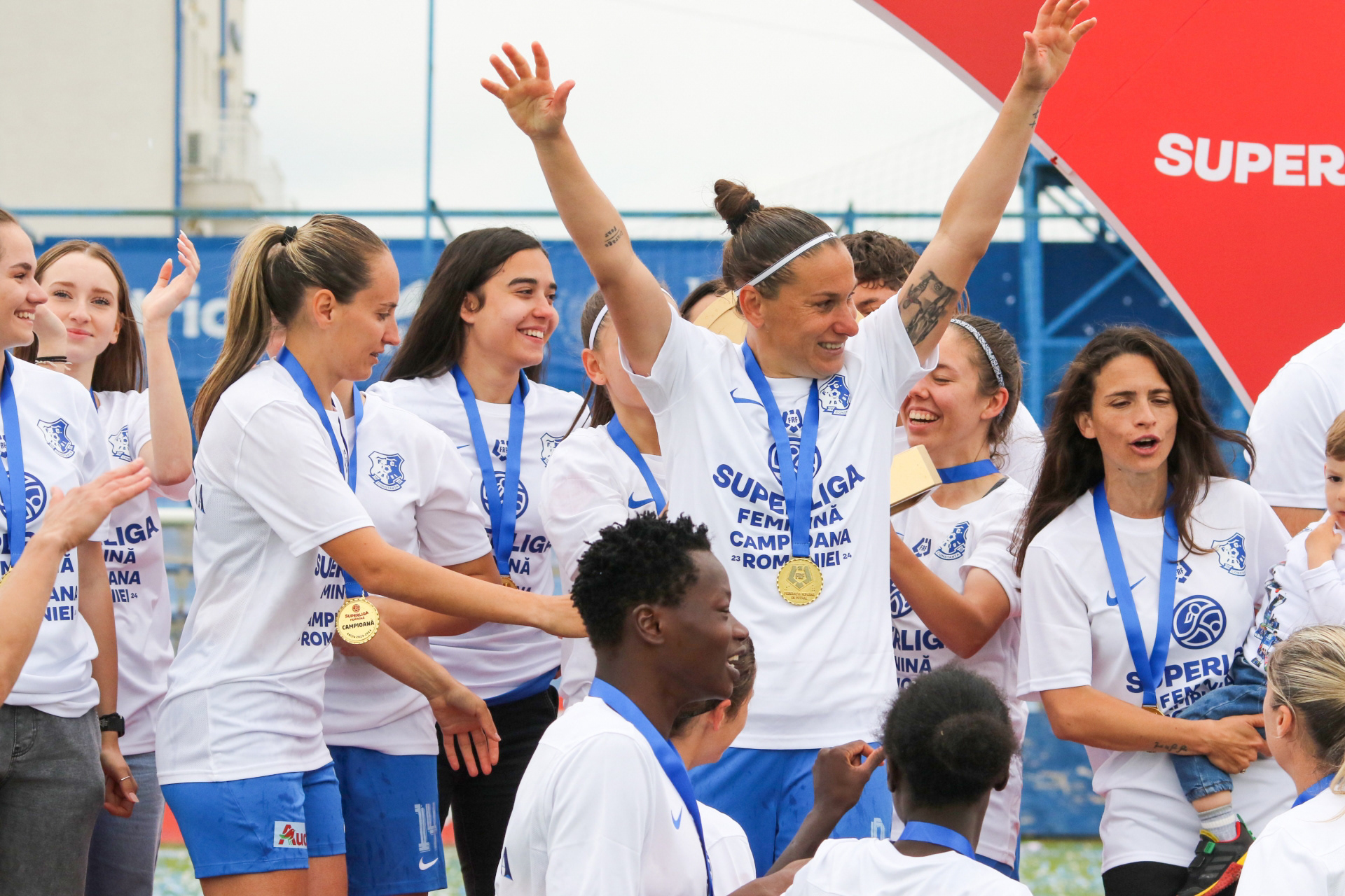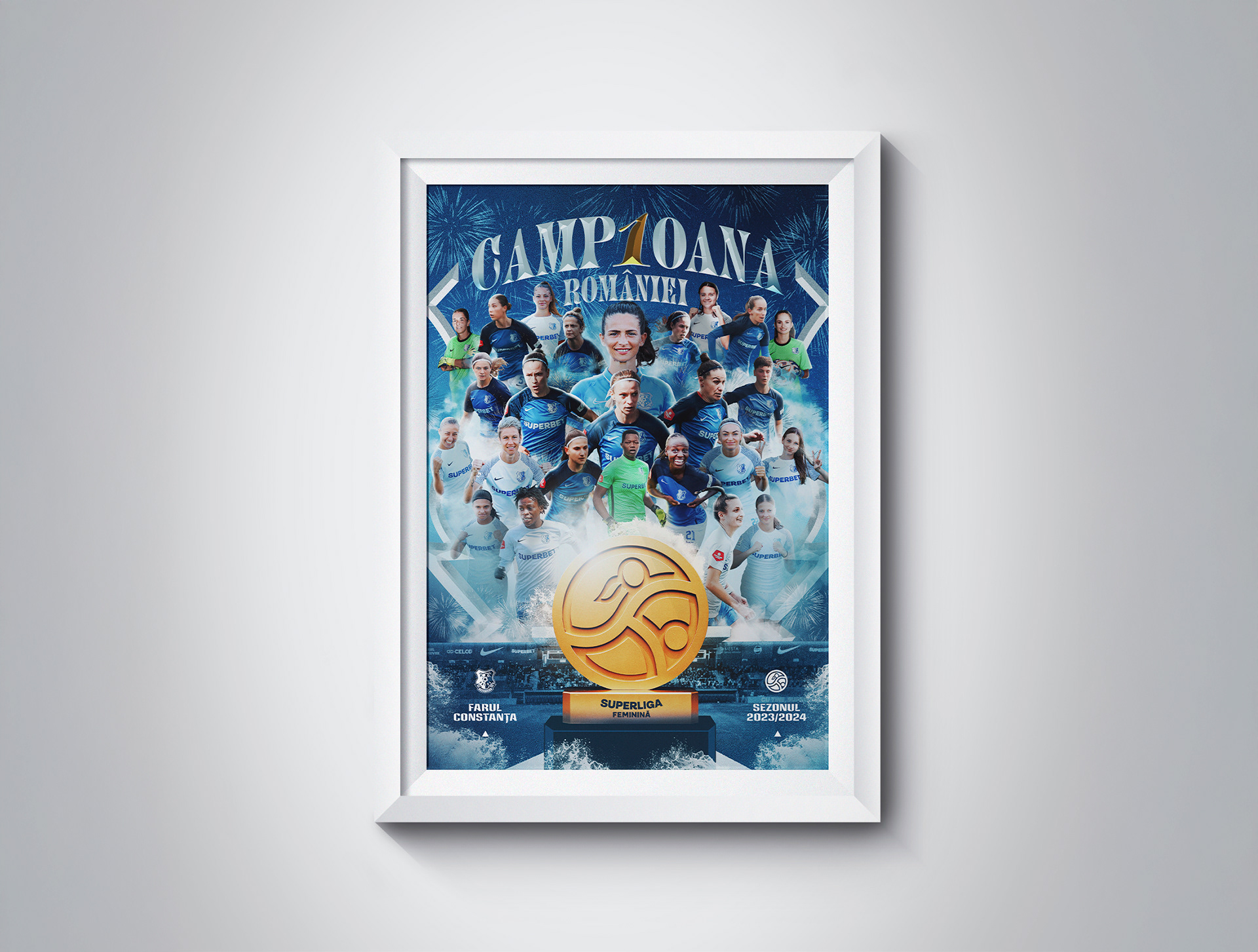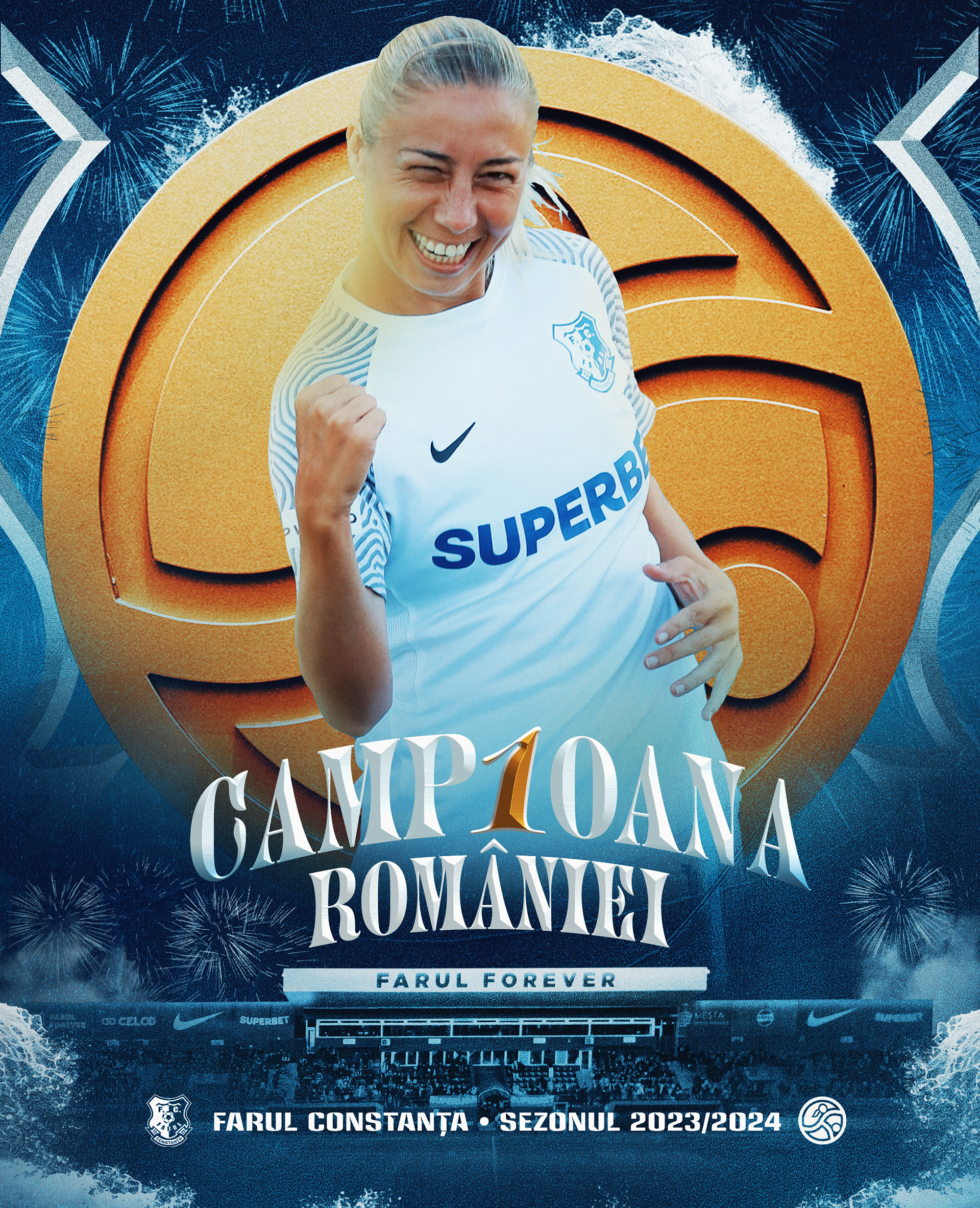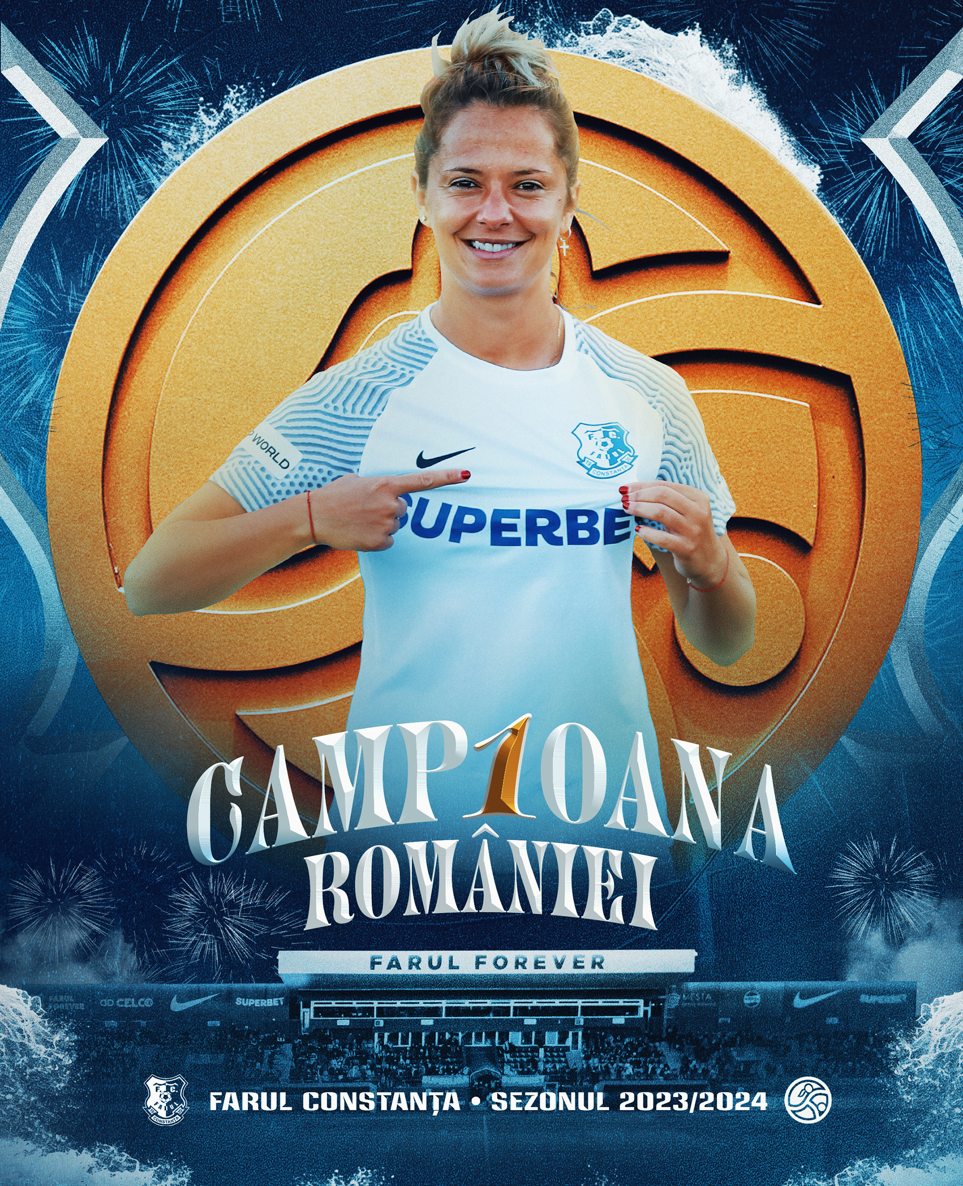 Context: Creation and execution of the complete art direction for the celebrations marking Farul Constanta Women’s historic Superliga Feminina title in the 2023/2024 season. An all-encompassing art direction, including the creation of various graphic assets to be featured across multiple platforms and media channels. The project includes digital communication on social media, official merchandise, LED graphics at the stadium, and more.